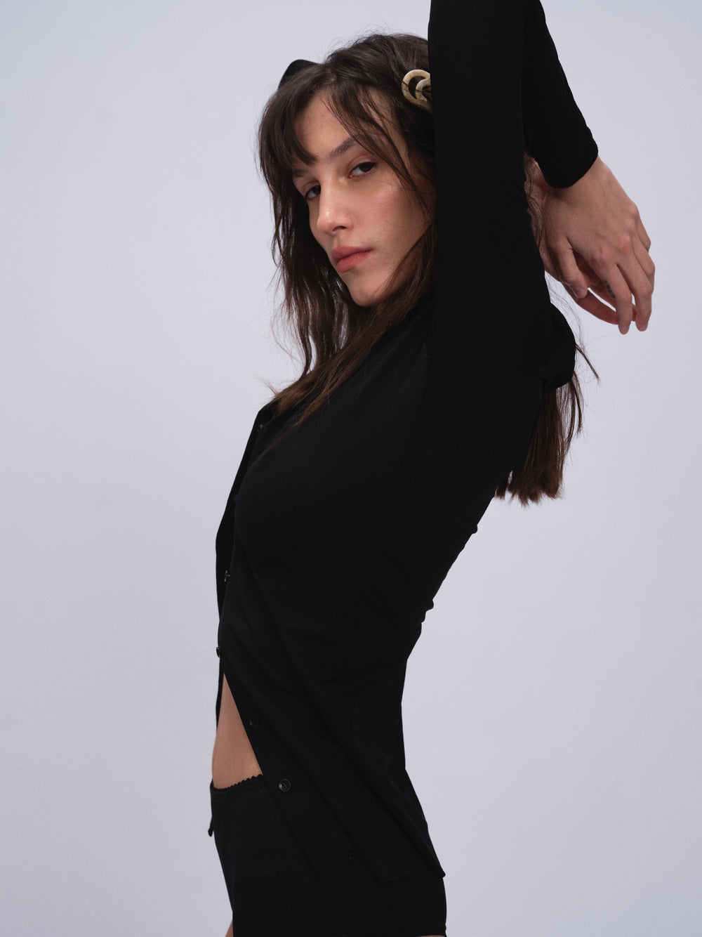 Camisa adherente de tela traslucida con spandex, cuello fino doble sin pespunte, acceso frontal mediante botones a tono, terminaciones de manga y ruedo al corte.