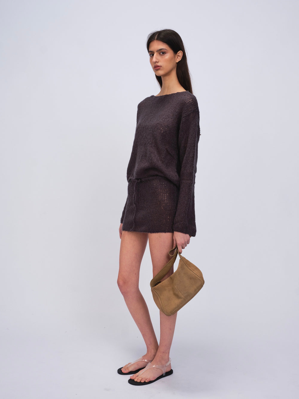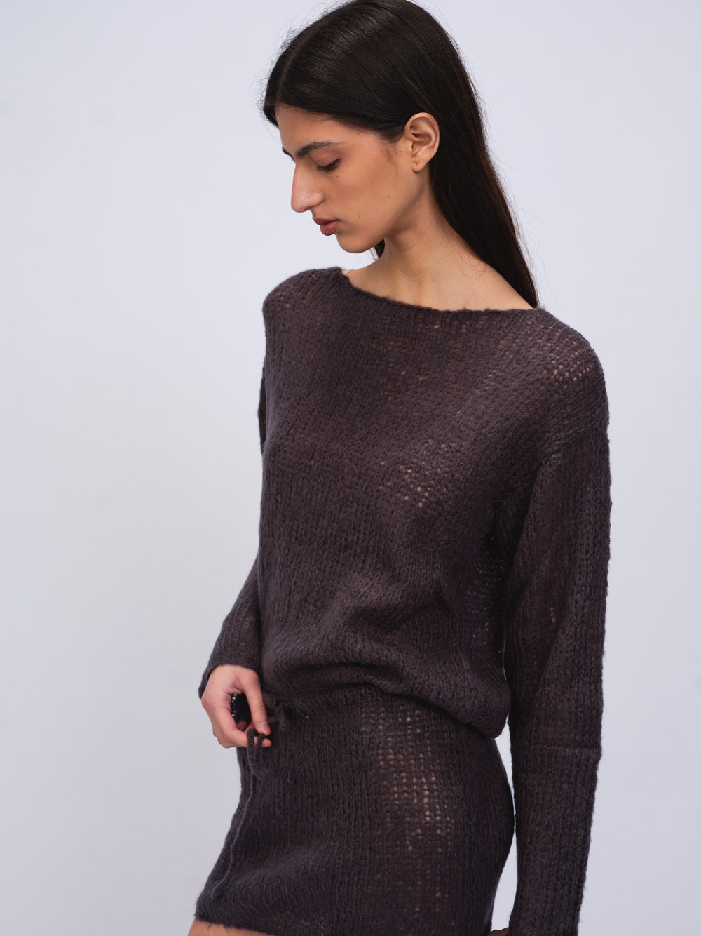Sweater tejido en mohair con punto abierto, cuello limpio, manga sutilmente acampanada.