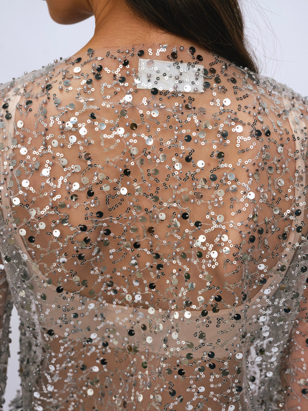 Top manga larga calce loose, tipo buzero, terminaciones al corte, confeccionado en tela con embelished italiano y perlas.
